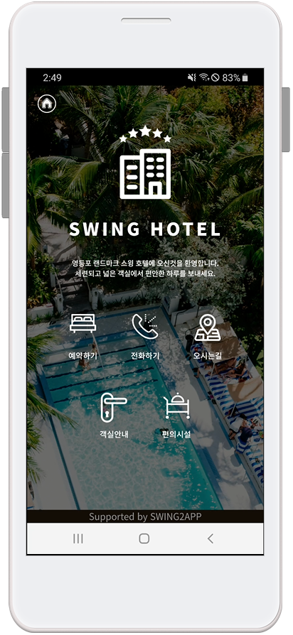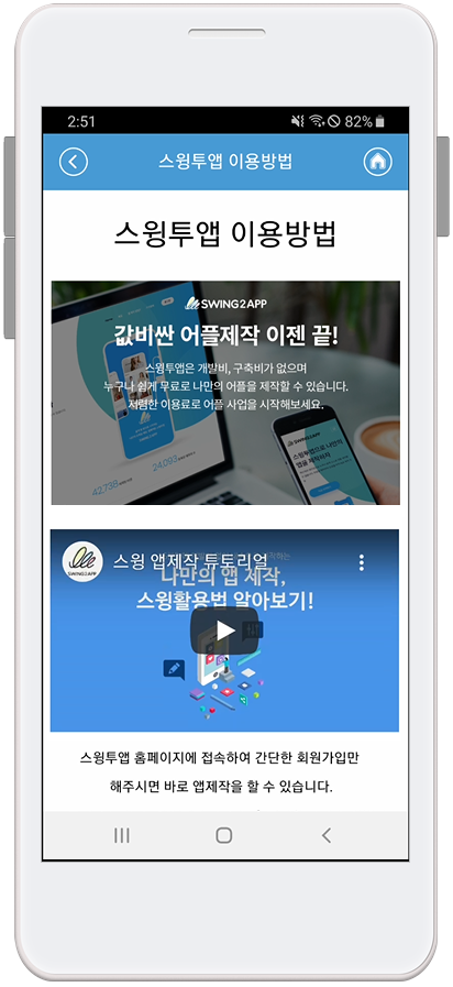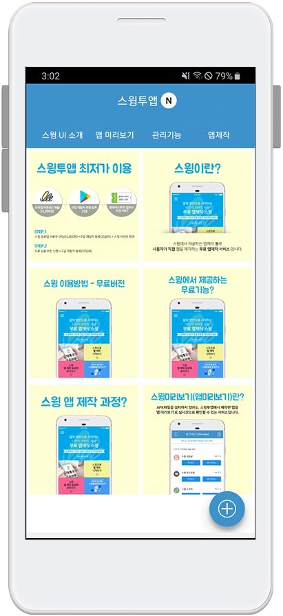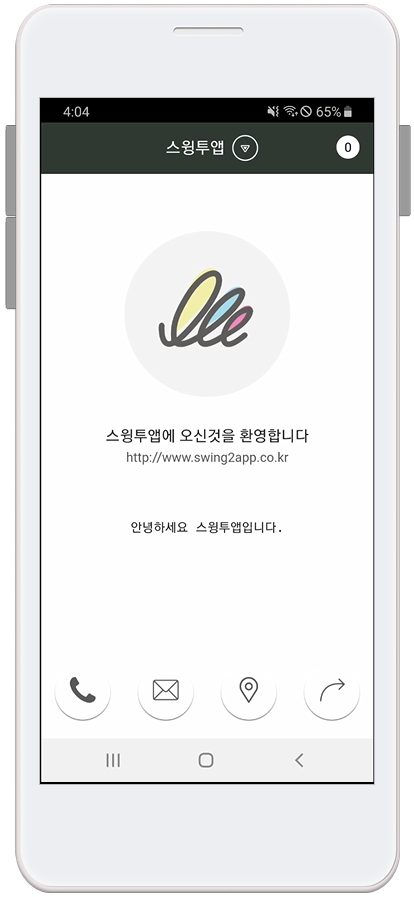 앱 소개 페이지는 처음 스윙투앱에서 앱을 제작할 때 홈화면으로 기본 셋팅이 되는 홈화면이에요.