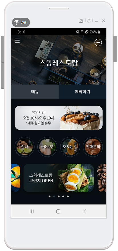 홈화면은 앱을 실행하면 가장 먼저 나타나는 앱 메인 화면이기 때문에 앱 디자인, 스타일에 맞게 메뉴를 적용해주셔야 합니다.