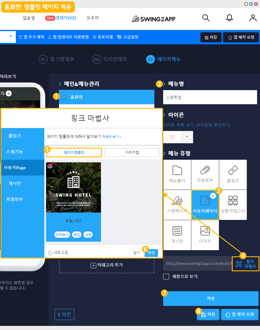 3)메뉴 유형에서 [스윙페이지]메뉴를 선택합니다.