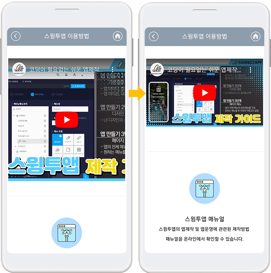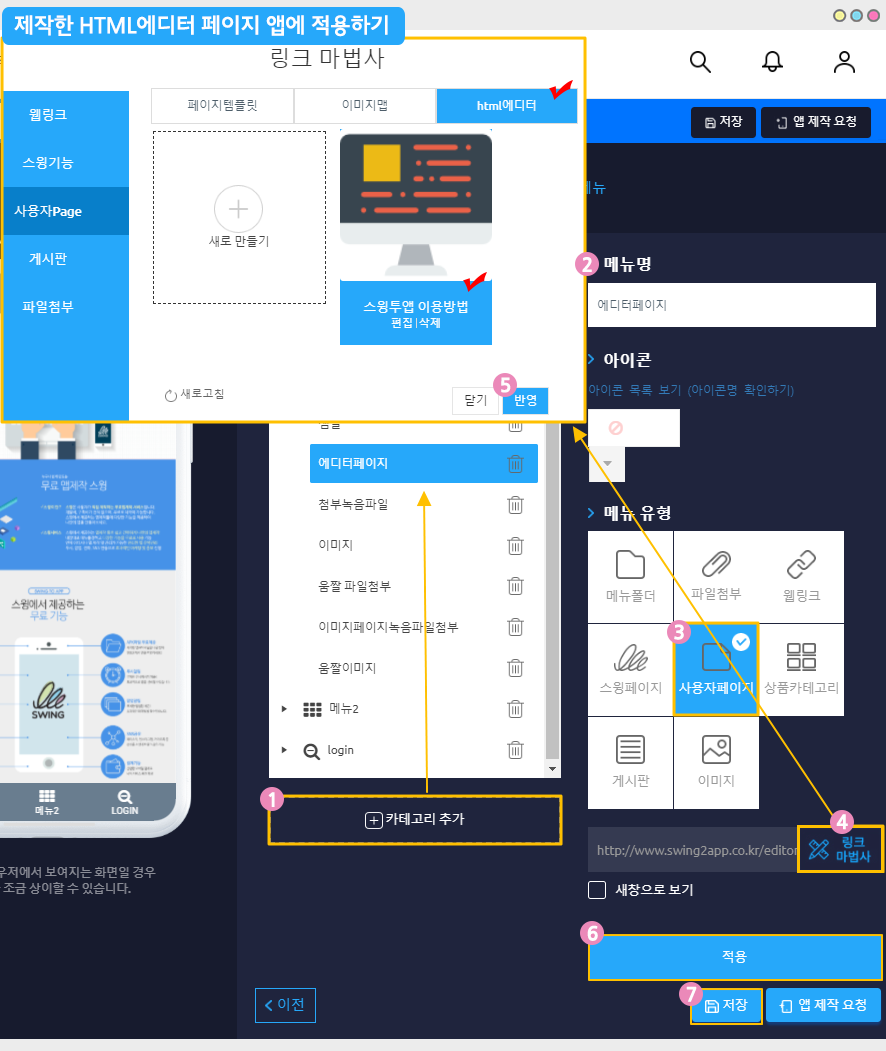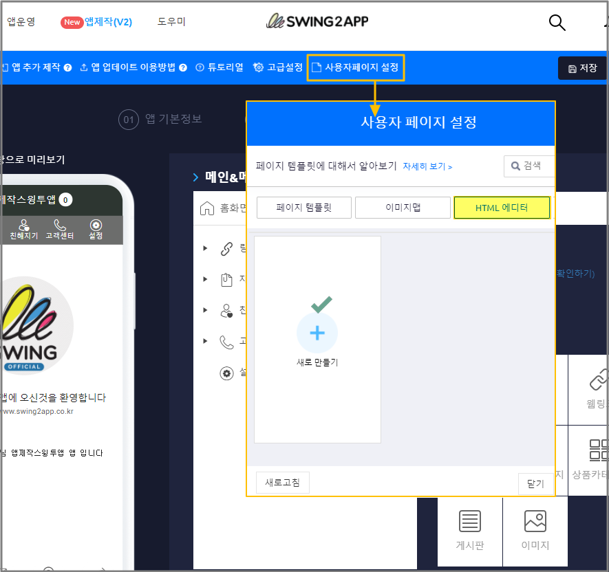 스윙투앱 사용자페이지에서 제공하는 기능 중 하나로 사용자가 직접 웹페이지를 제작할 수 있는 메뉴에요.