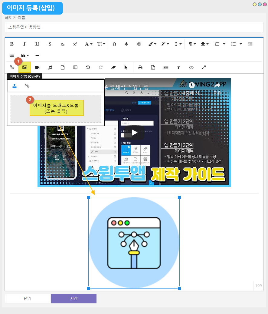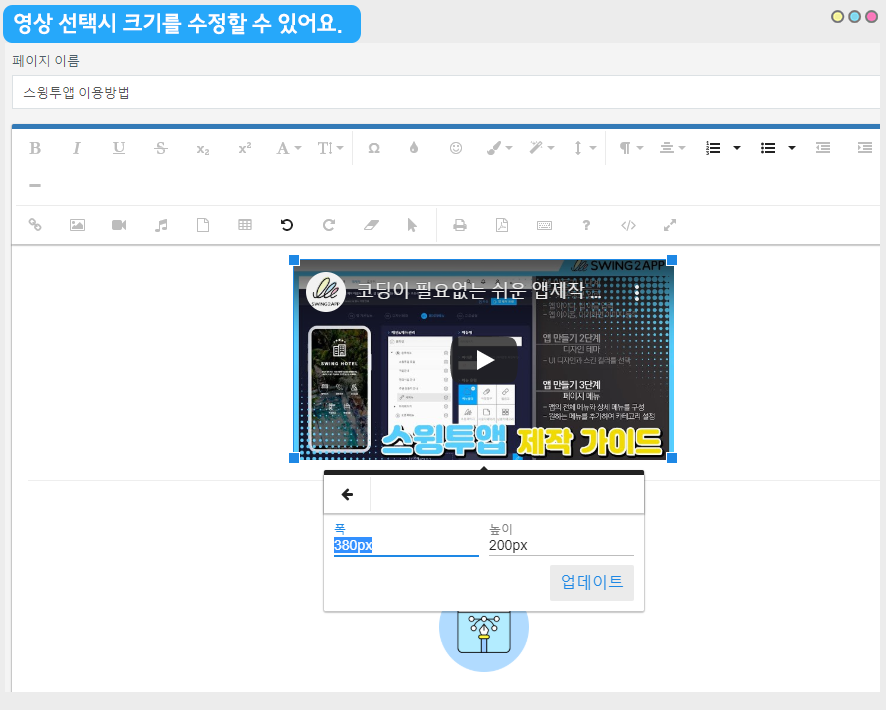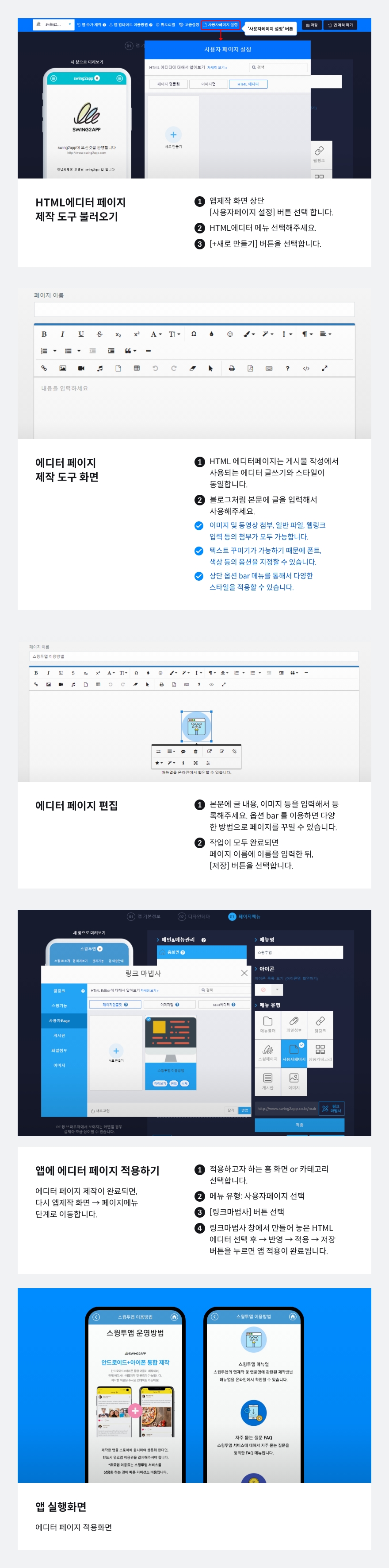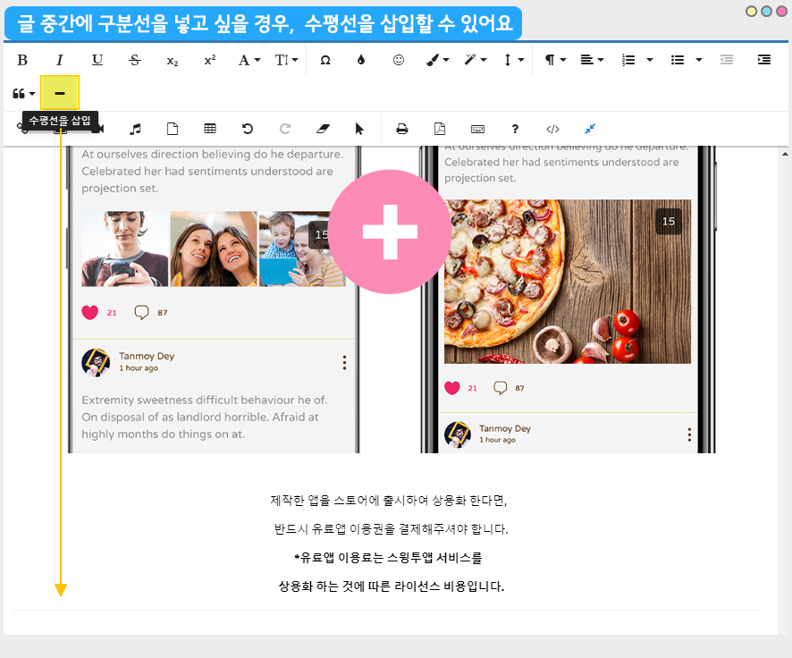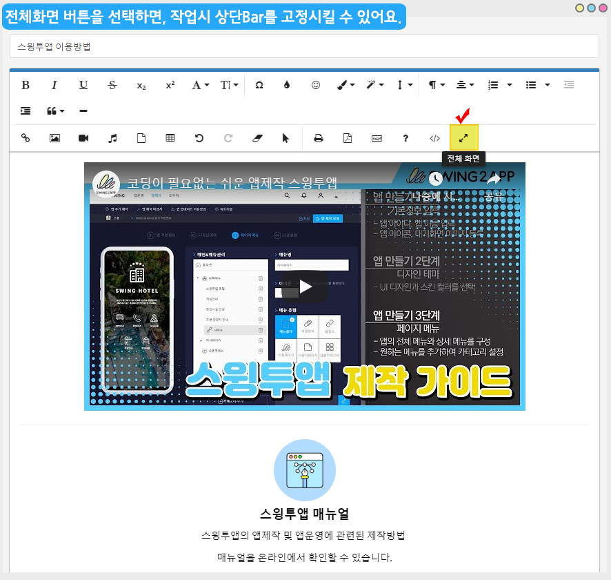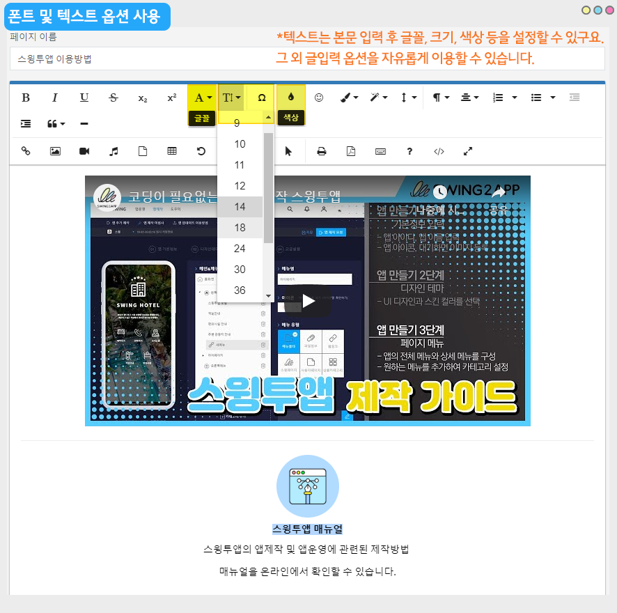 스윙투앱 공식앱에 적용된 HTML에디터 페이지에요.