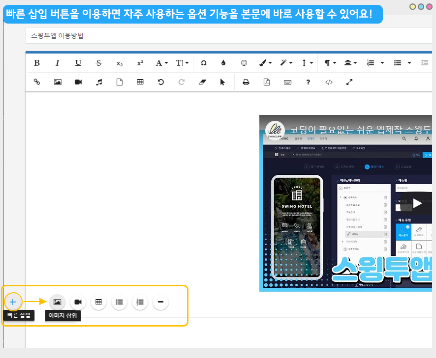빠른 삽입 버튼으로, 해당 버튼을 선택하면 이미지 삽입, 동영상 삽입, 수평선 삽입 등 자주 사용하는 옵션기능을 빠르게 이용할 수 있어요.