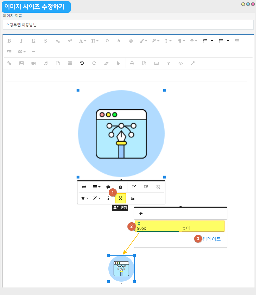 대신 이미지가 화면에 작게 나와야 할때는 저처럼 이미지 크기를 작게 수정해주시면 됩니다.