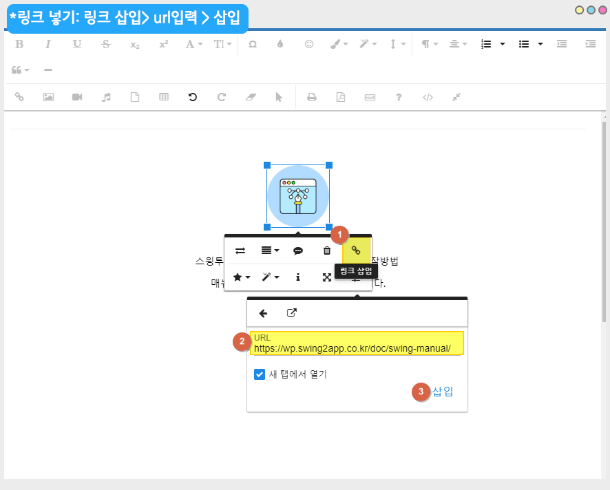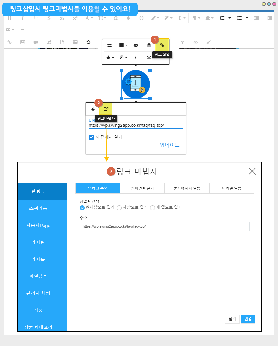 3)링크 마법사 팝업 창이 새롭게 열리구요. 왼쪽 메뉴를 선택해서 원하는 스윙 기능을 넣어주실 수 있습니다.