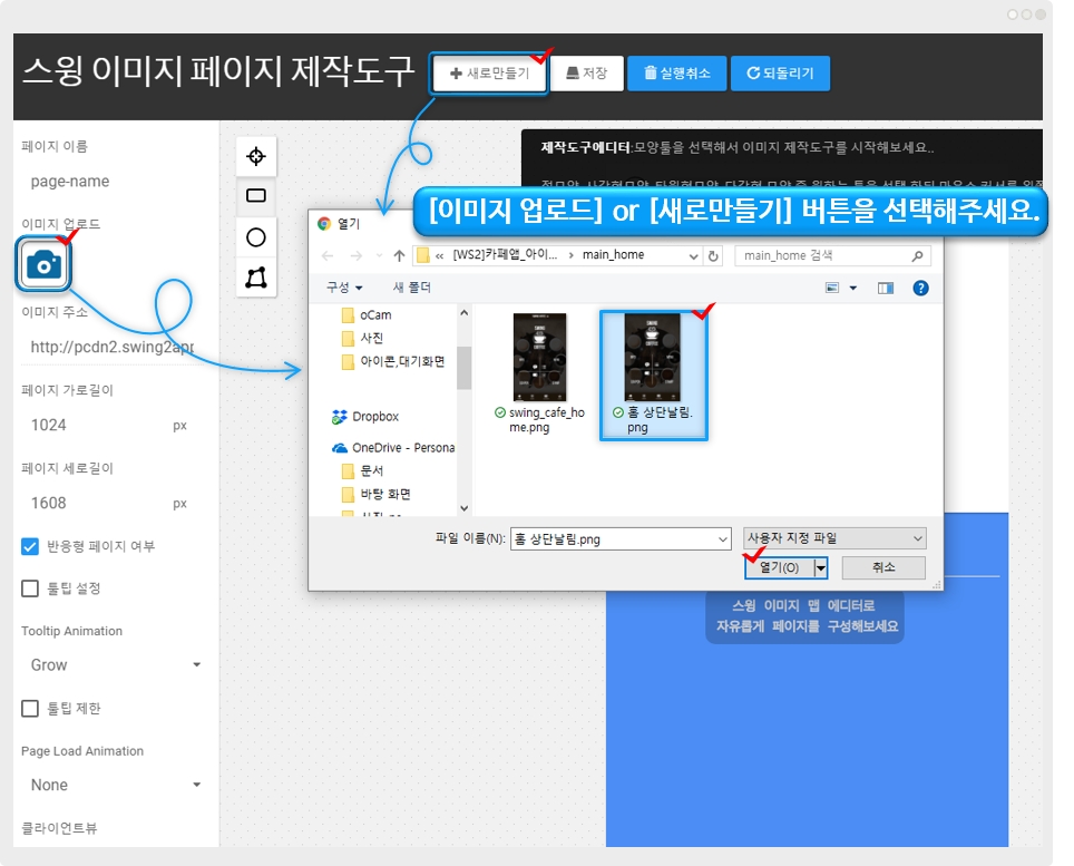 이미지페이지 제작도구에서 [새로들기] 버튼을 선택한 뒤 이미지를 불러와주세요.