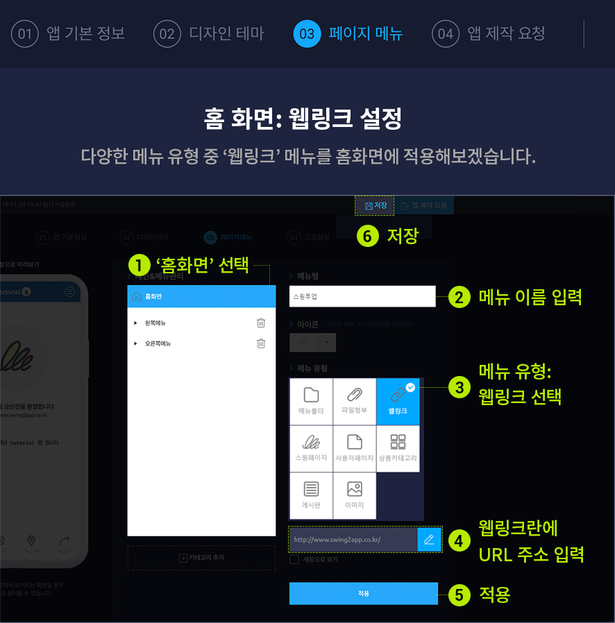 3) 메뉴 설정에 있는 [웹링크] 메뉴를 선택합니다. (스윙 홈페이지 URL: http://www.swing2app.co.kr 를 넣었습니다.)