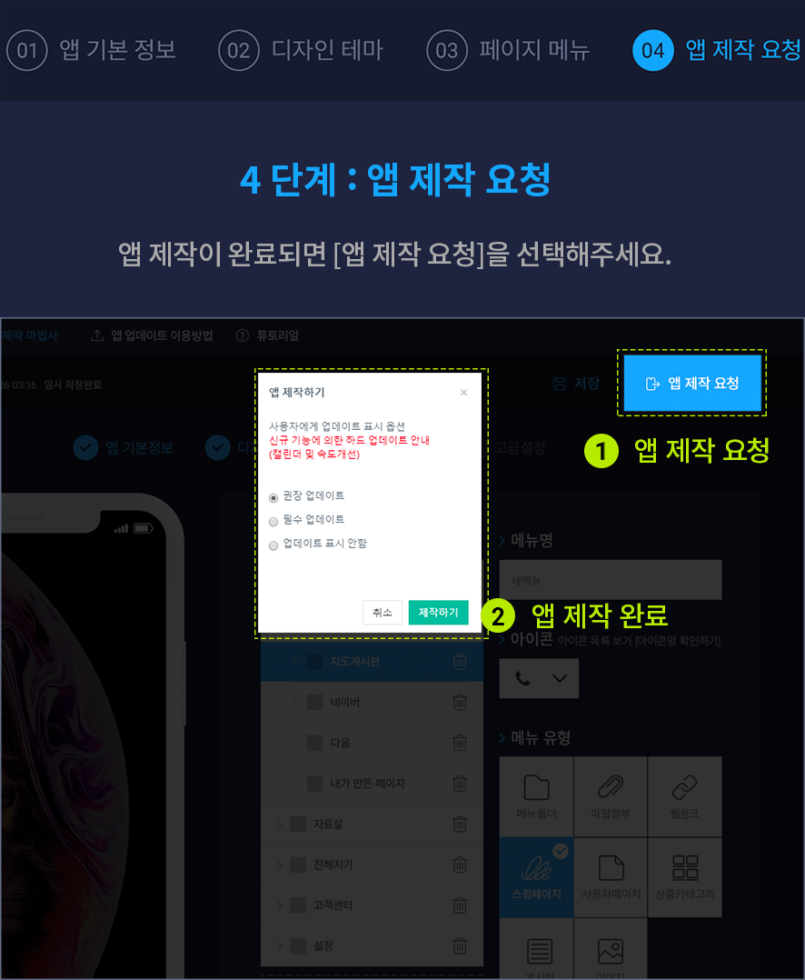 페이지메뉴까지 제작이 완료되면 앱제작 요청 버튼을 눌러서 앱제작을 완료해주세요.