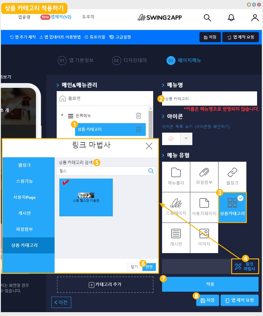 앱제작 화면 3단계 페이지 메뉴 단계로 이동합니다.