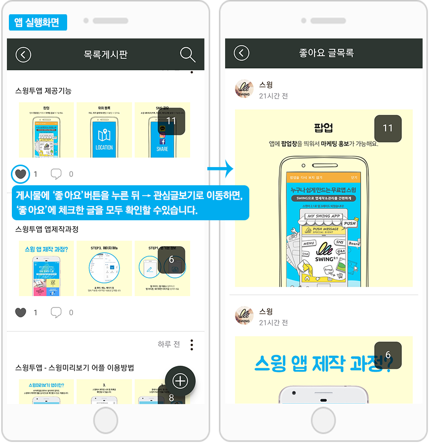 관심글보기는 앱제작 → 페이지메뉴 단계 → 스윙 페이지에서 이용할 수 있어요.