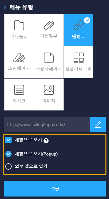 페이지메뉴- 메뉴유형: [웹링크] 를 이용하는 방법
