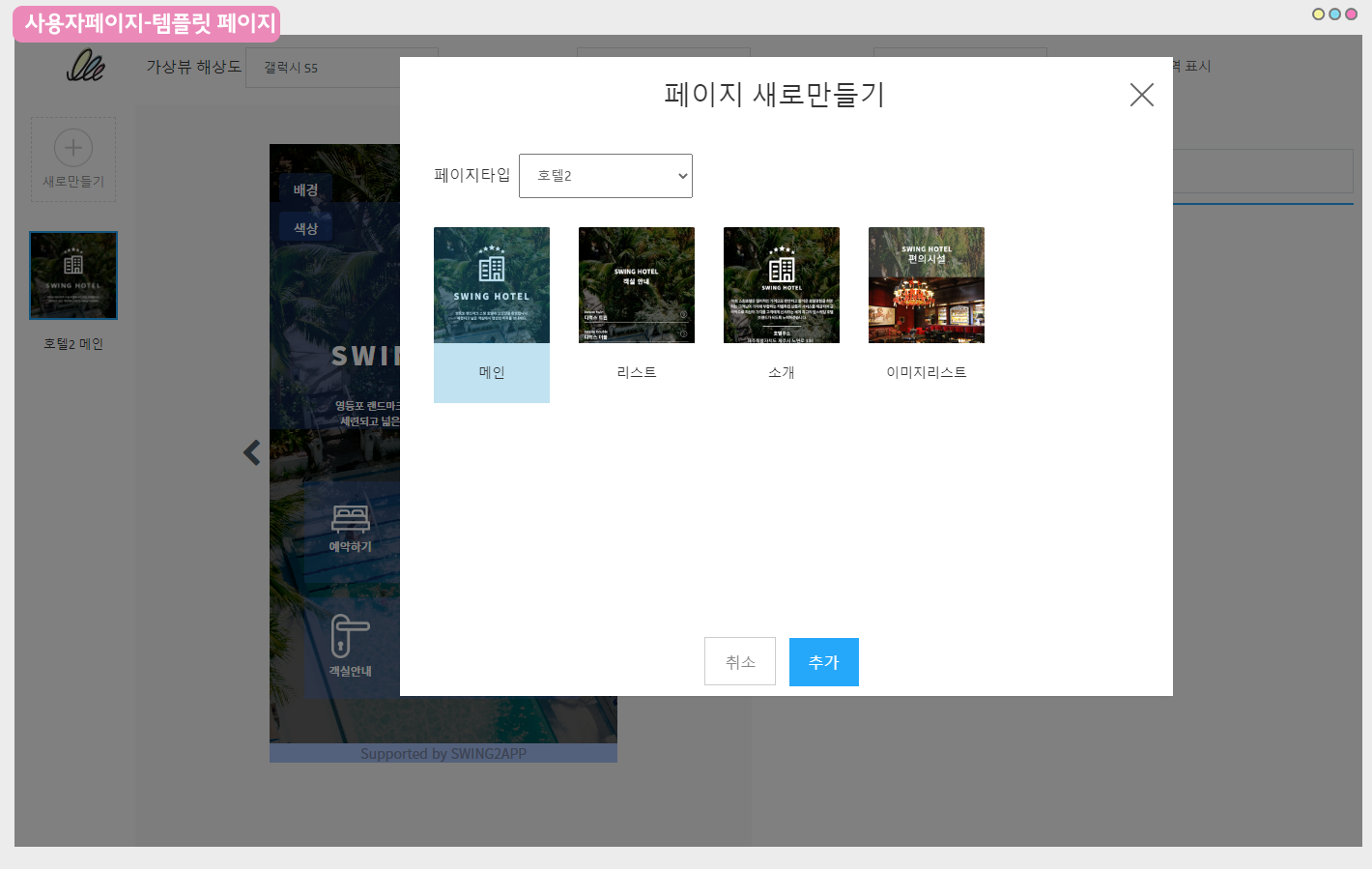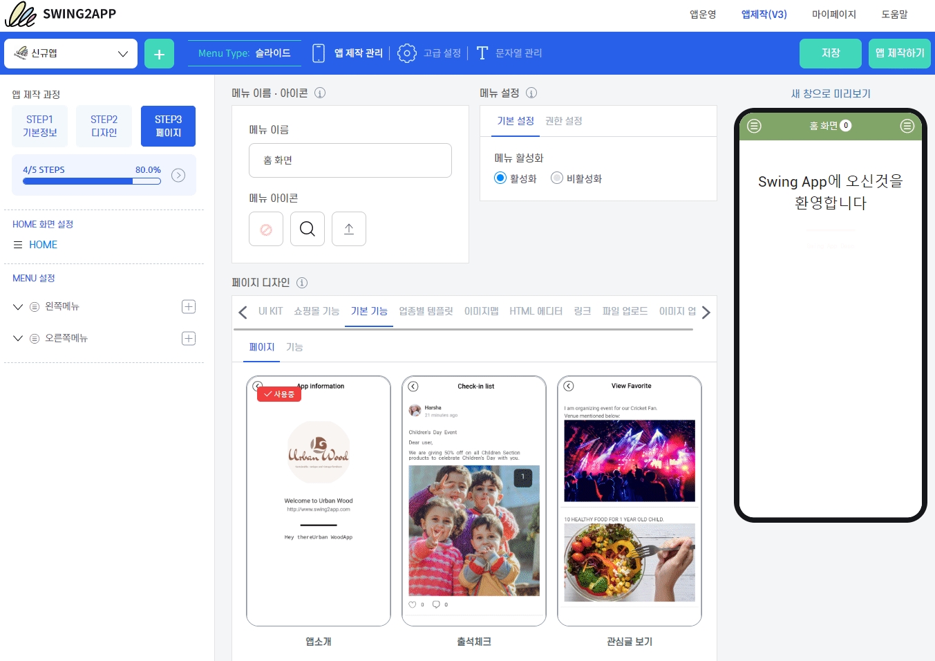 스윙투앱에서 제공하는 메뉴 – 웹링크, 스윙페이지, 사용자페이지, 게시판, 이미지 등의 메뉴를 적용할 수 있습니다.