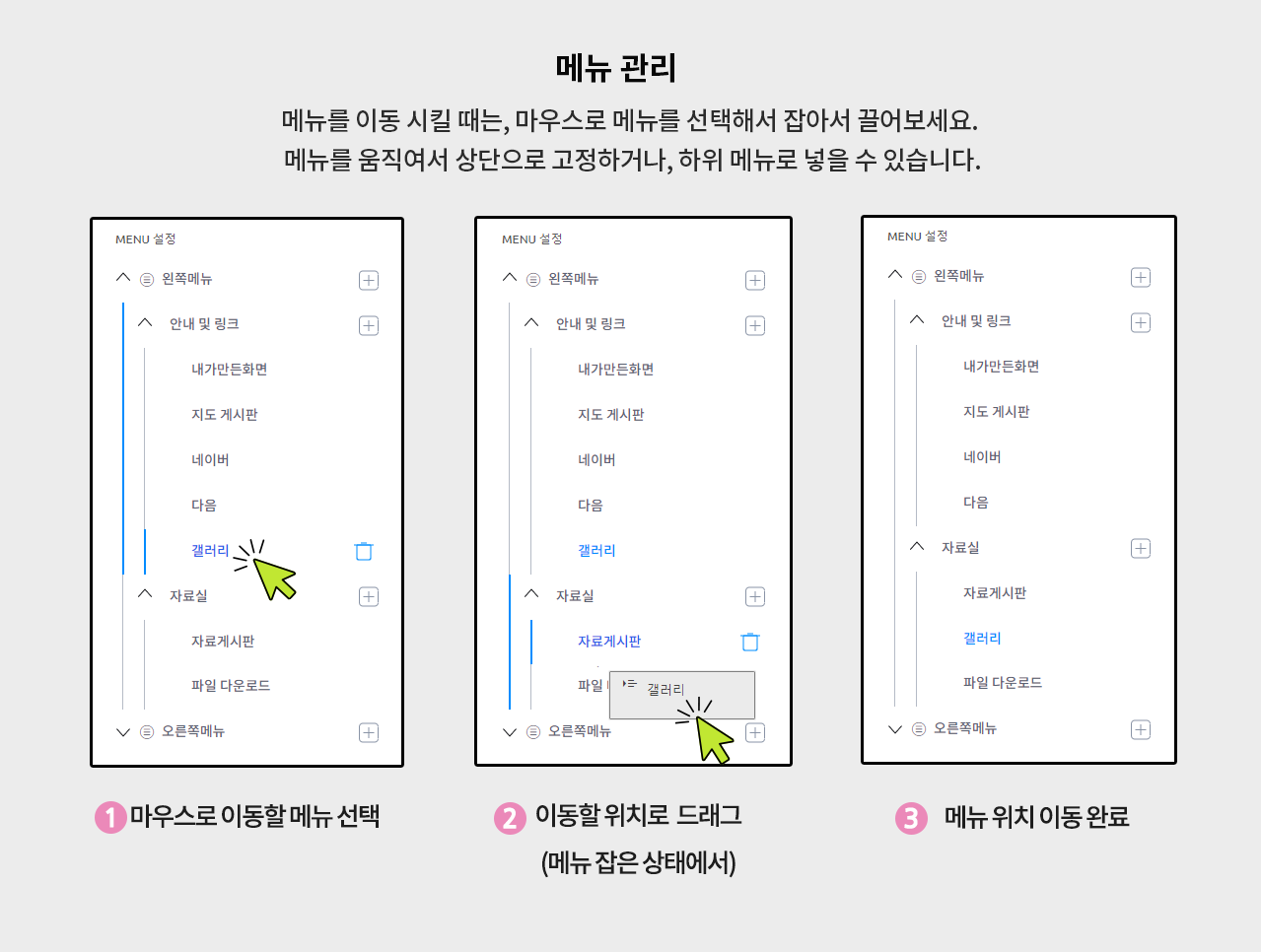드래그하는 위치로 메뉴 이동이 완료됩니다. – 하위 혹은 상위 메뉴로 구성할 수 있습니다.