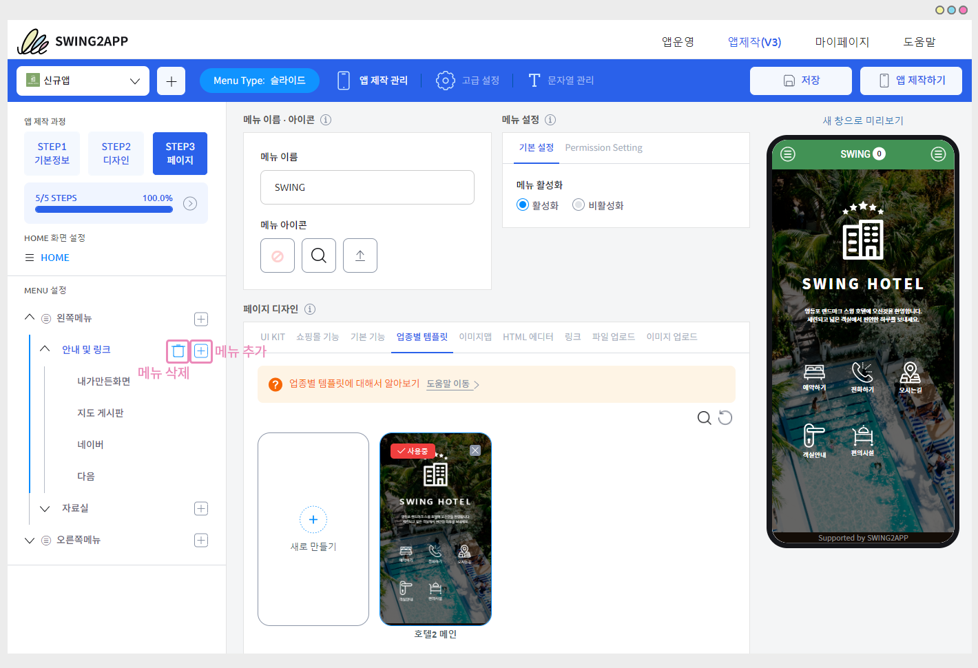 왼쪽 카테고리에 기재된 메뉴들은 스윙투앱에서 초기 셋팅한 메뉴들로 모두 수정하여 사용할 수 있습니다.