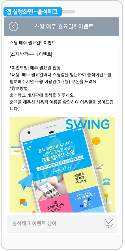 다양한 출석체크 이벤트로 앱 회원들의 참여를 이끌어낼 수 있습니다.