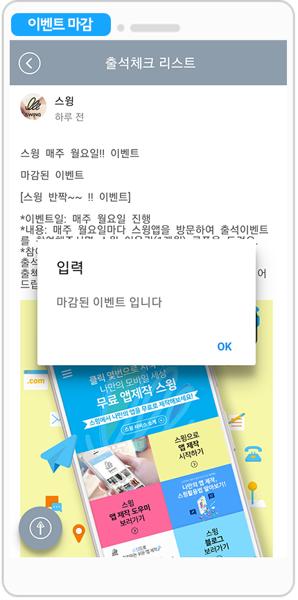 이벤트를 마감하게 되면, 앱에서도 ‘마감된 이벤트’라고 창이 뜨게 됩니다.