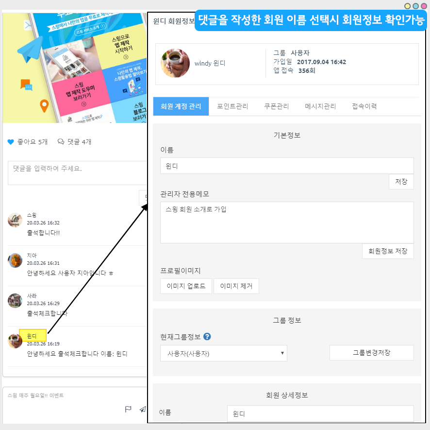 사용자 이름을 선택하면, 해당 회원 정보를 확인할 수 있습니다.