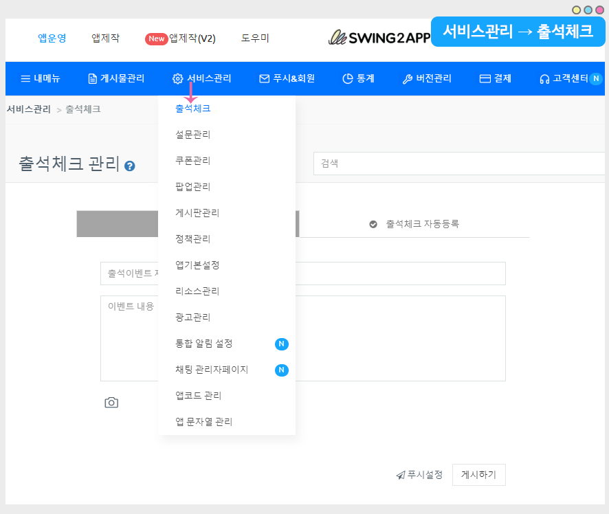 출석체크 등록은 앱운영 – 서비스관리에서 만들 수 있으며 상세 매뉴얼을 확인해주세요.