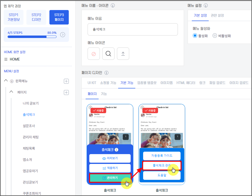 새로운 출석체크 등록이나, 수정이 필요할 경우 앱제작 메이커에서 바로 이동하여 관리할 수 있습니다.