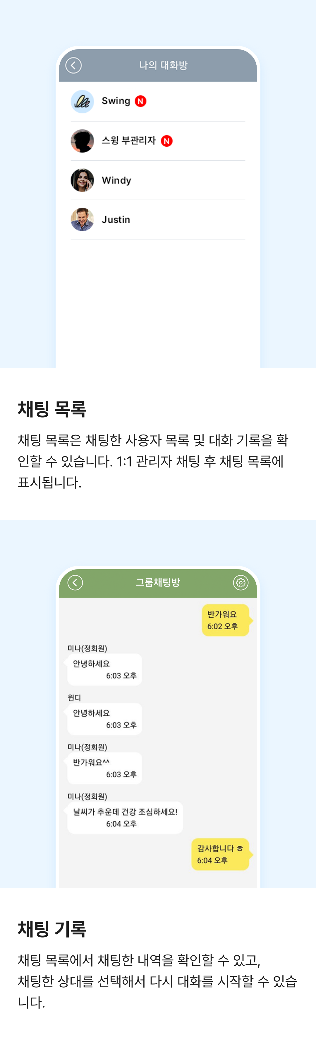 *2019.3.8 이전에 제작한 앱은 [채팅목록] 메뉴가 스윙페이지에서 보이지 않습니다.반드시 업데이트 후 이용해주세요.