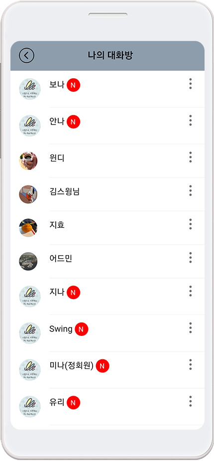 앱 메뉴의 – 채팅목록을 선택하면 위의 이미지처럼 사용자가 관리자와 채팅한 목록을 확인할 수 있습니다.