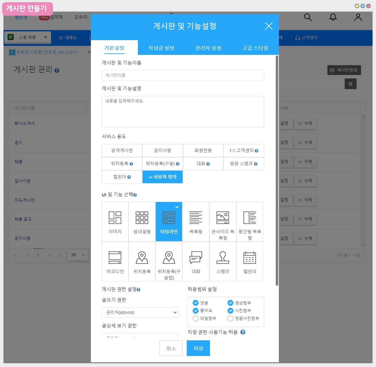 위의 [새로 만들기] 를 선택하면 게시판 관리 화면으로 이동합니다.