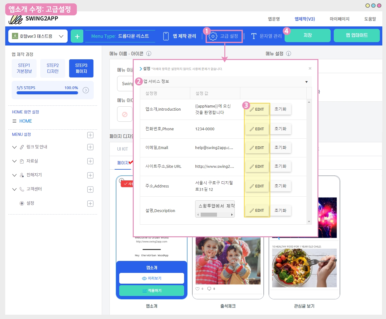 앱소개 페이지에 기재되는 소개, 설명, 주소, 이메일주소, 전화번호, 웹사이트 주소 등은 [고급설정]에서 수정해서 사용할 수 있습니다.