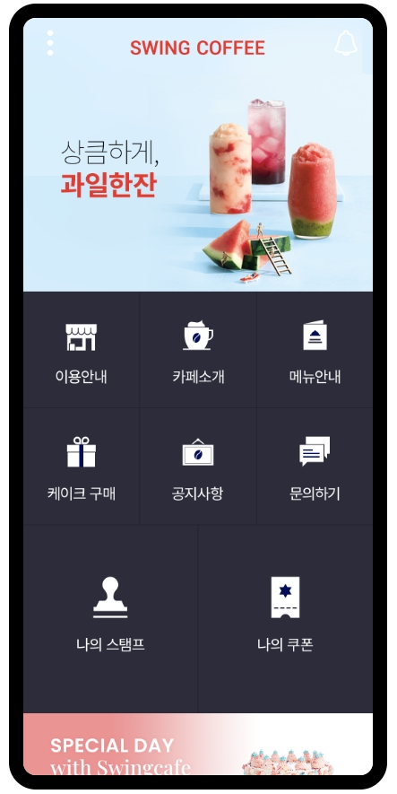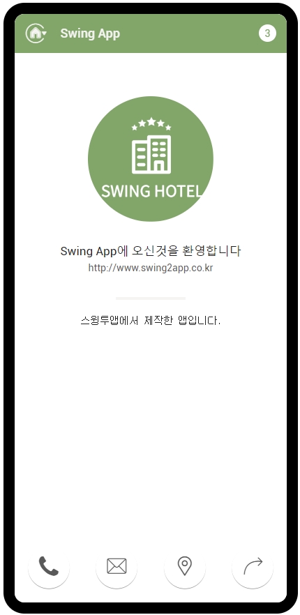 앱 소개 페이지는 처음 스윙투앱에서 앱을 제작할 때 홈화면으로 기본 셋팅이 되는 홈화면이에요.
