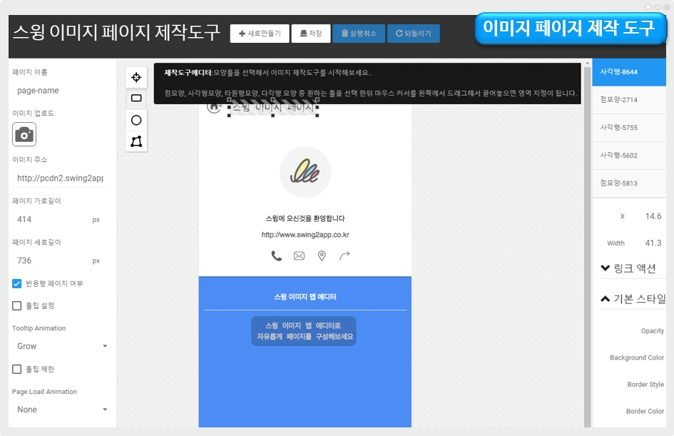 위의 [새로 만들기] 를 선택하면 이미지 페이지 제작도구 화면으로 이동합니다.