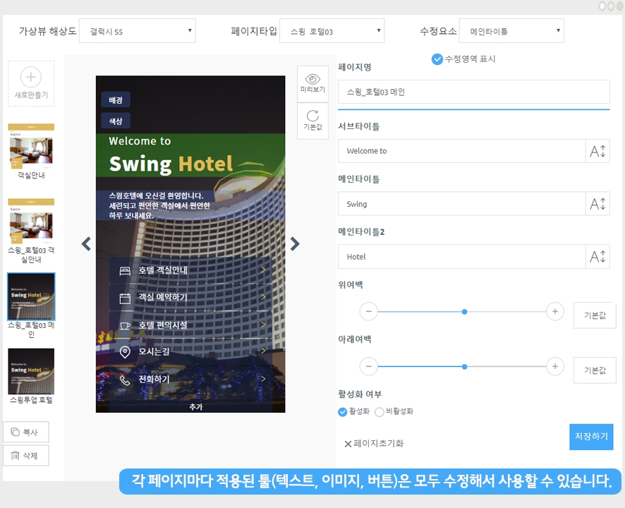 이미지페이지를 적용했다가 템플릿 페이지를 적용하는 등 자유롭게 다른 메뉴로 변경할 수 있구요.