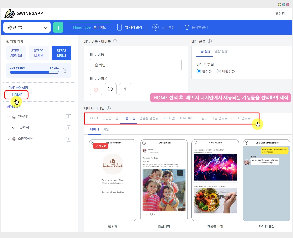 홈화면 제작은 앱제작 메이커 → STEP3 페이지 → HOME 화면 설정→ HOME 버튼을 선택해서 제작할 수 있습니다.