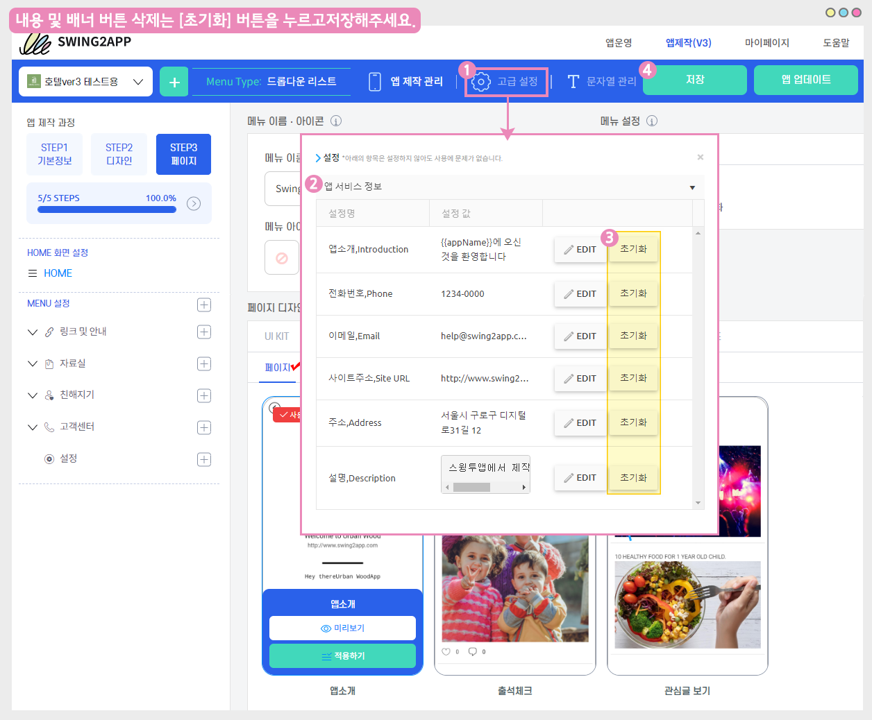 고급설정 – 앱 서비스 정보에서 ‘전화번호, 이메일, 사이트주소, 주소, 앱설명’에 있는 [초기화] 버튼을 눌러주세요