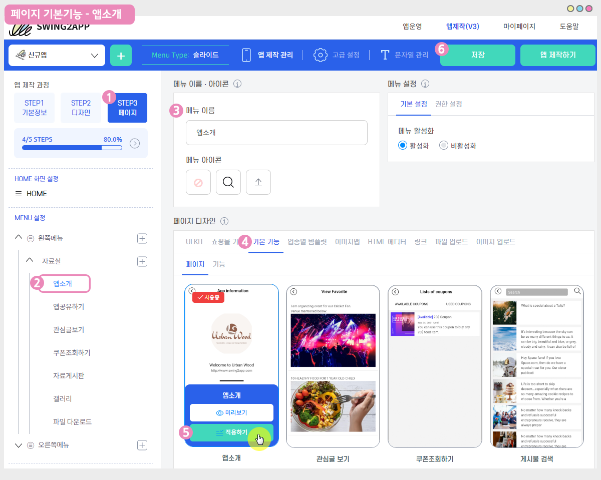 앱소개는 스윙페이지에서 제공하는 홈화면 스타일로, 메인 홈화면을 꾸미는 메뉴 중 하나입니다.