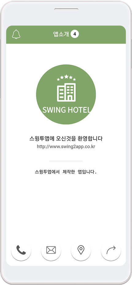 앱소개는 처음 스윙투앱으로 앱제작을 하시는 분들에게 기본으로 셋팅하여 제공해드리는 홈 메인화면이에요.