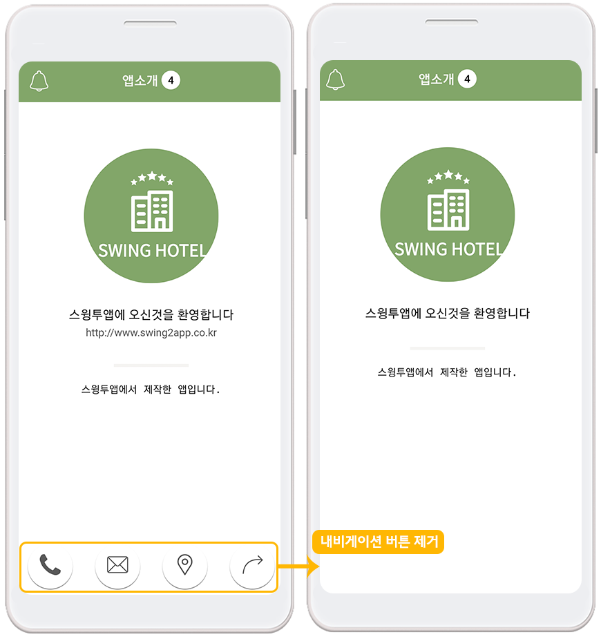 처음 스윙투앱으로 앱을 제작할 때 홈화면에 어떤 것을 넣어야 할지 모르기 때문에, 사용자분들에게 홈화면 가이드라인으로 보여드리고자 앱소개 페이지를 기본 셋팅하여 제공해요.