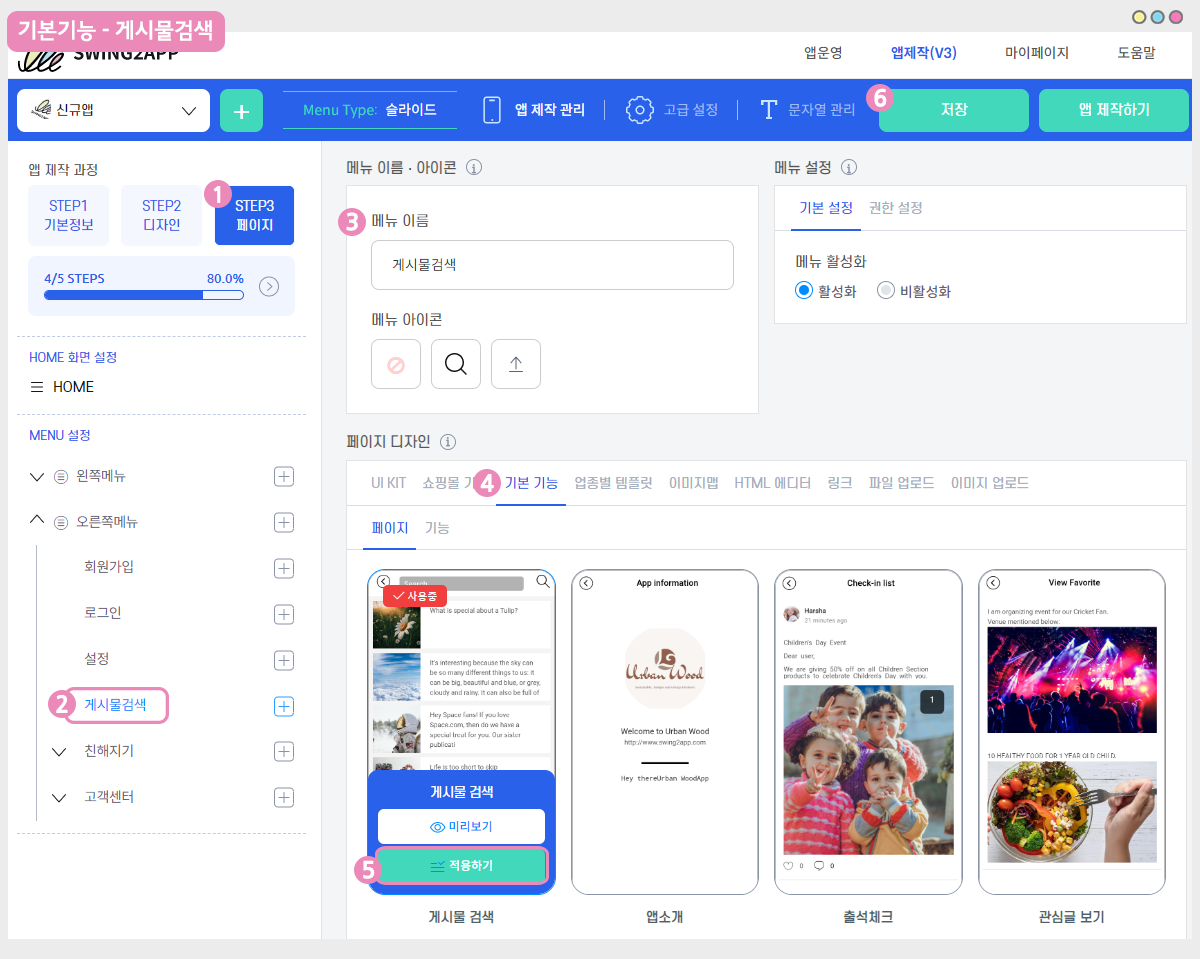 5) ‘게시물 검색’ 페이지를 찾아서 [적용하기] 버튼을 선택해주세요. (페이지에 마우스 커서를 가져다 대면 적용하기 버튼이 열립니다)