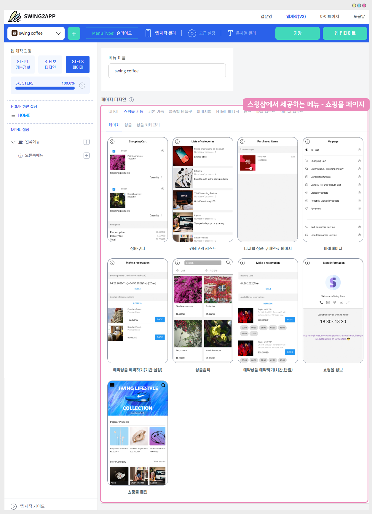 *앱제작→ STEP3 페이지 → 페이지 디자인에서 [쇼핑몰 기능] 선택→ [페이지]를 선택하면 스윙샵(쇼핑몰 운영에 필요한 페이지) 관련 페이지들을 확인할 수 있습니다.