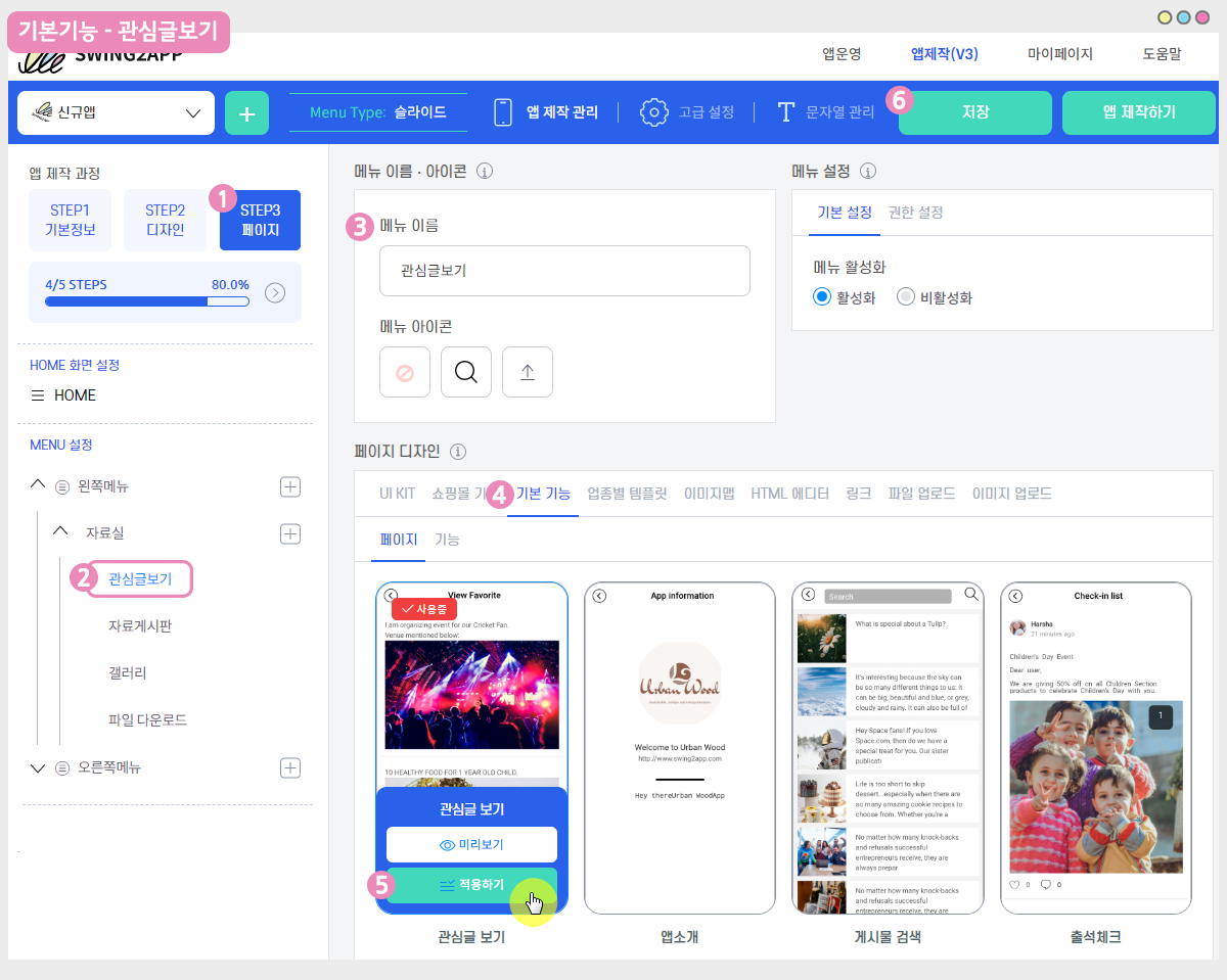 *업데이트 기준 2019.1.7 이후 앱을 신규 제작하거나, 업데이트 하신 분들은 ‘관심글보기’ 적용 후 저장만 해주시면 됩니다.