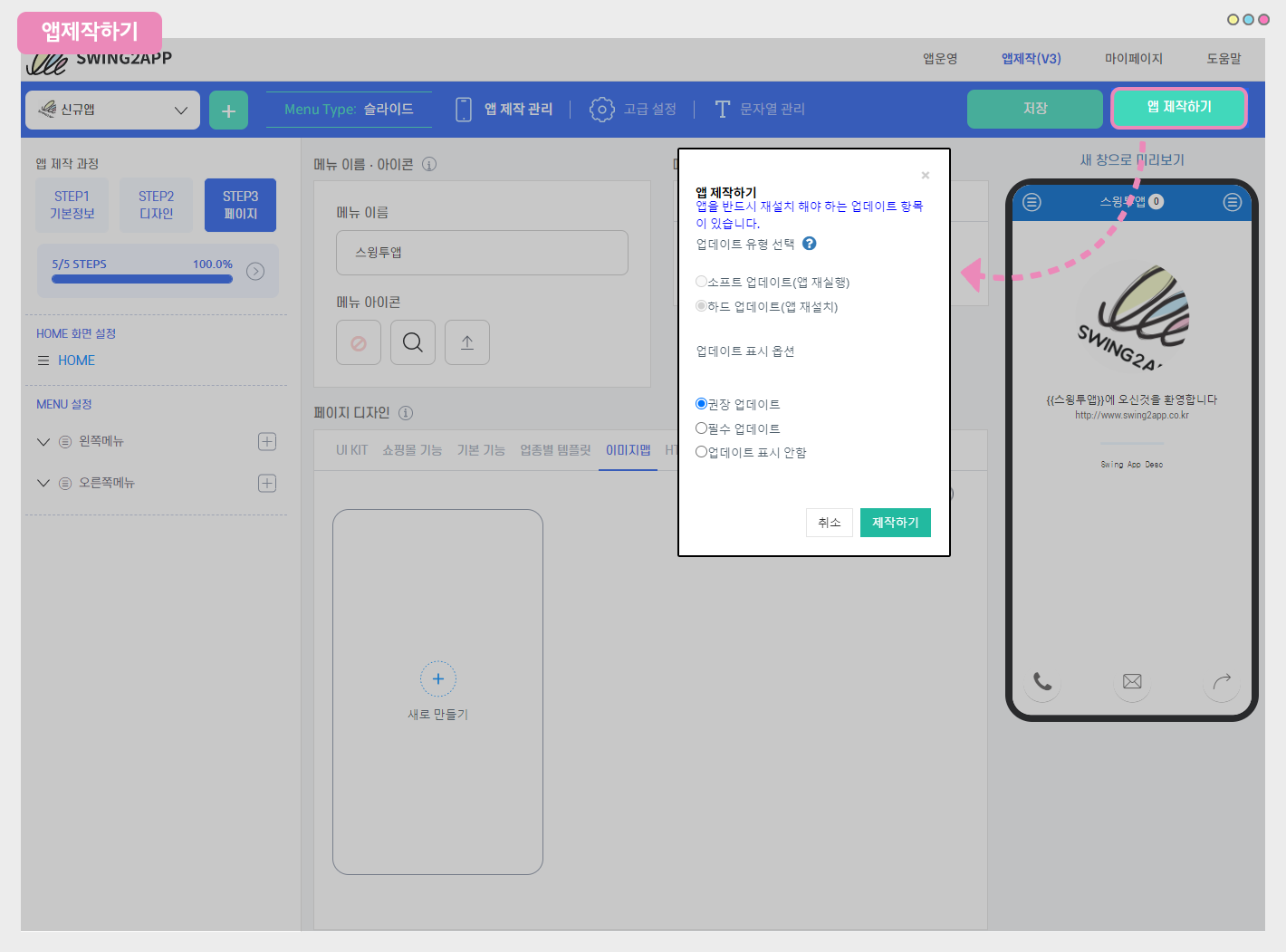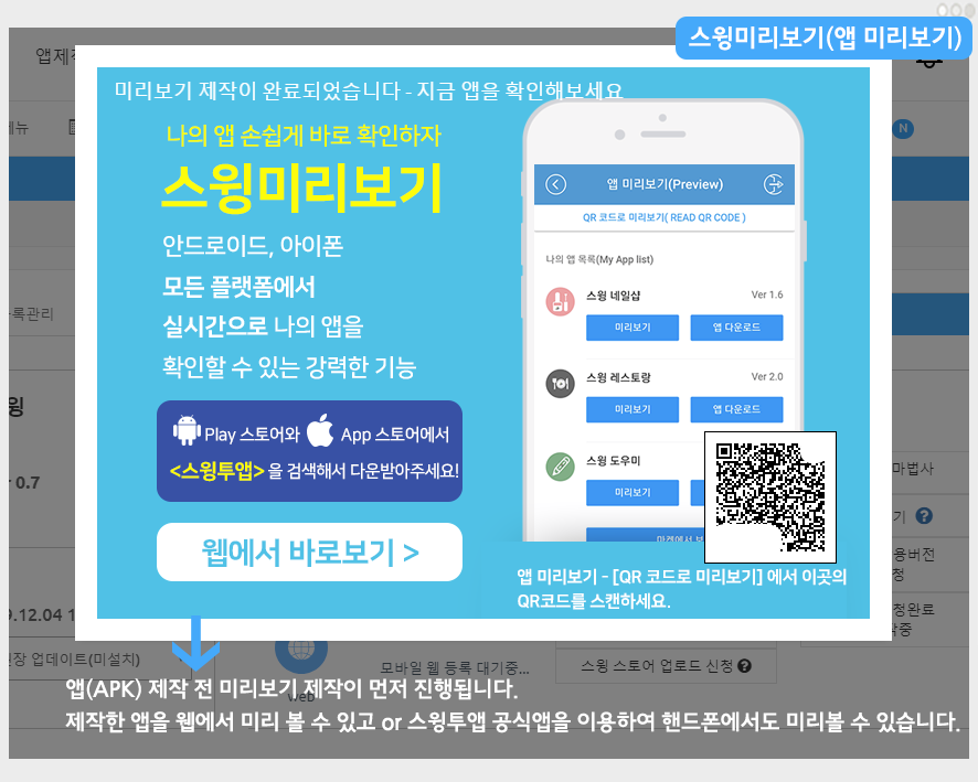 스윙투앱 앱 메이커에서 제작이 완료되면, 제작된 앱을 다운 받을 수 있도록 앱 제작하기를 선택해주세요.