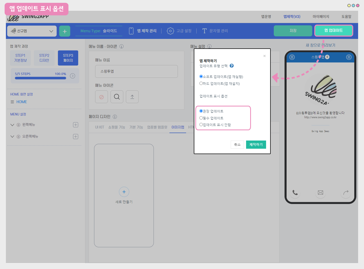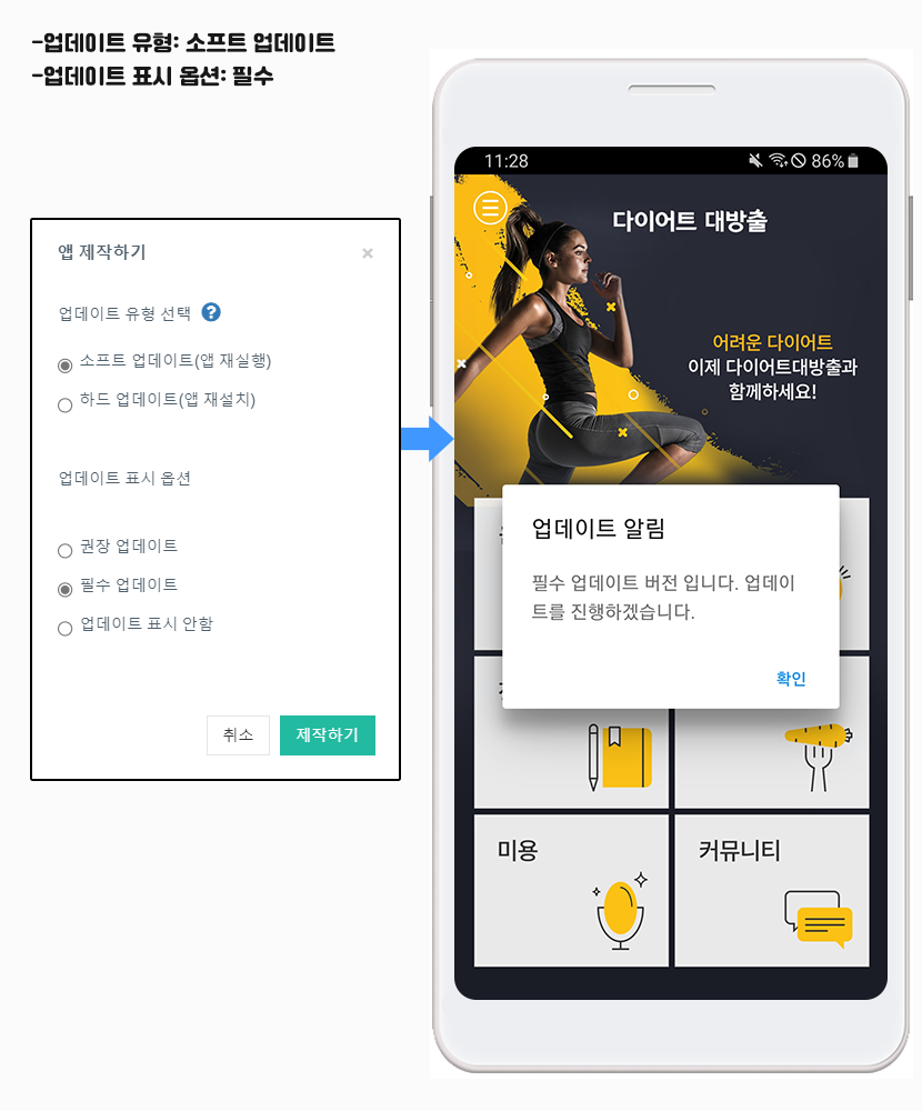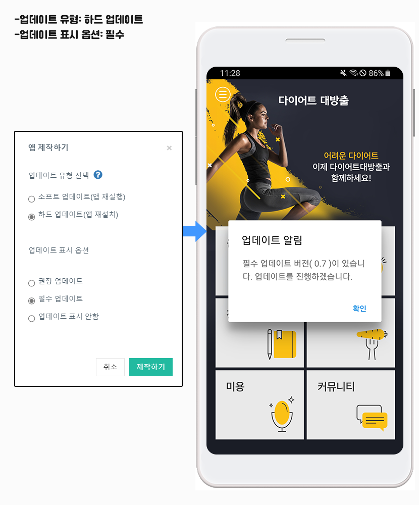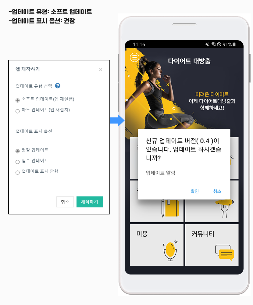 [앱 업데이트]를 선택하면 업데이트 유형, 업데이트 표시옵션 항목을 사용자가 정해서 제작할 수 있습니다.