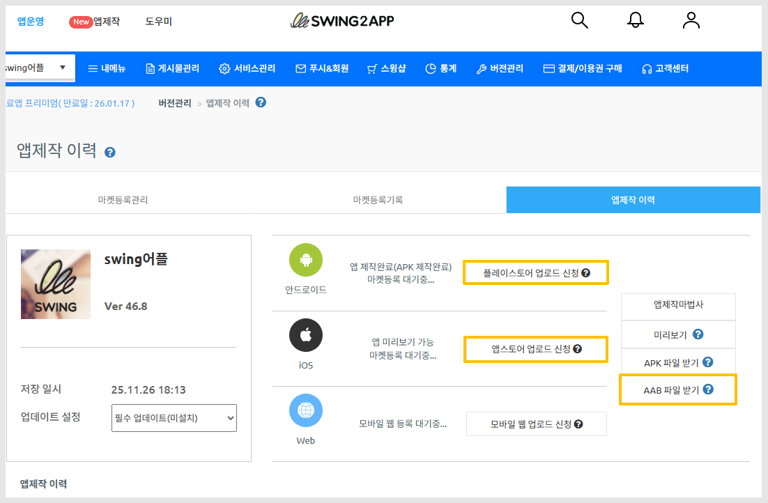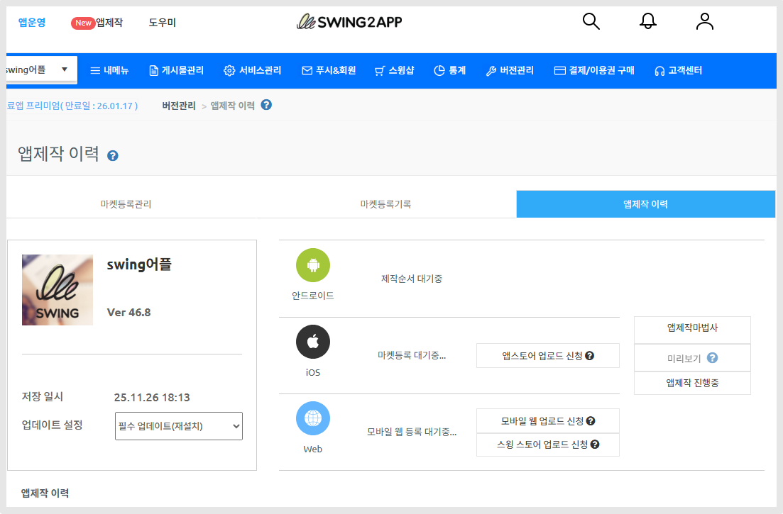 &#x20;[앱운영 – 버전관리 - 앱제작 이력](http://www.swing2app.co.kr/view/app_work_history)