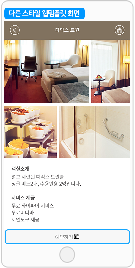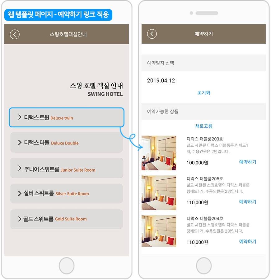 호텔 샘플앱에서는 웹템플릿을 홈화면 메인으로 걸고, 해당 버튼마다 예약하기 링크를 적용해서 예약상품을 구매할 수 있도록 했어요.