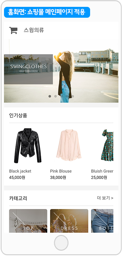 *쇼핑몰 메인 페이지는 가장 기본적인 쇼핑몰 디자인 UI이며, 많은 사용자들이 스윙샵 앱제작시 이용하고 있습니다.