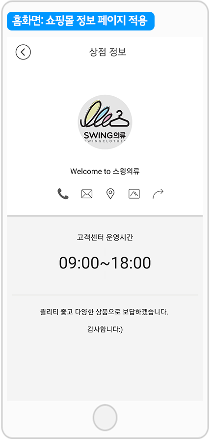 *쇼핑몰 정보 페이지는 상점의 정보: 운영시간, 상점 소개말, 아이콘 이미지, 공유하기/전화 걸기 등의 아이콘 배너가 보여지는 페이지입니다.