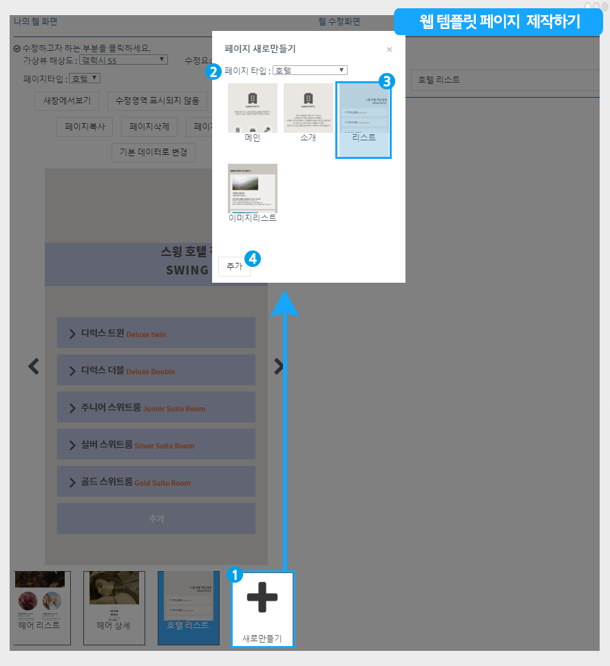웹 템플릿 페이지 제작도구 창이 열리면, 아래 방법대로 진행해주세요.
