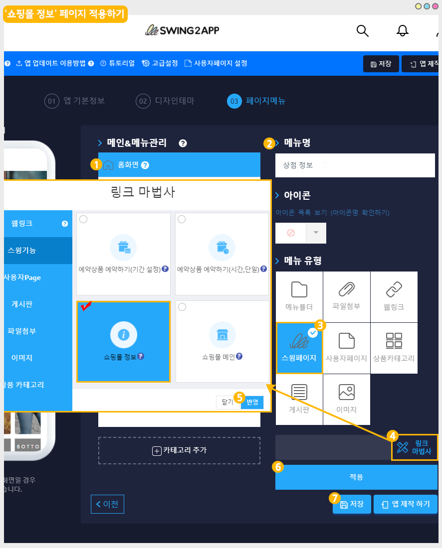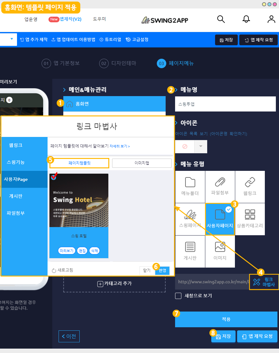 사용자페이지에서는 링크마법사 기능(웹링크, 앱 메뉴 연동 등)을 제공하기 때문에 스윙샵에서 만들어놓은 메뉴로도 연동할 수 있어요.