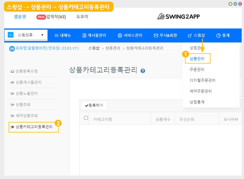 스윙샵 메뉴에서 → 상품관리 → 상품카테고리 등록관리 페이지로 이동합니다.