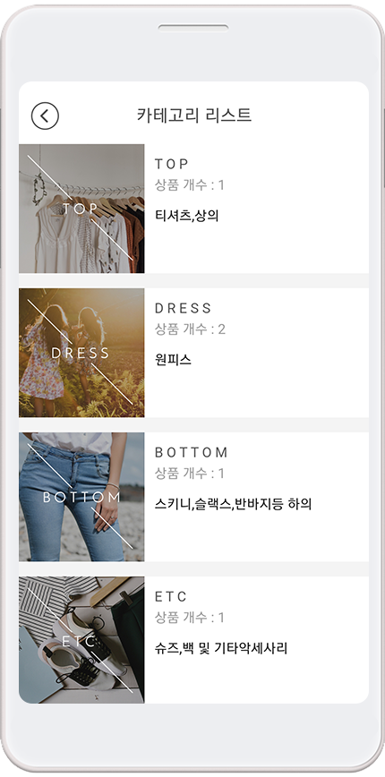 카테고리 리스트는 앱에 등록된 모든 카테고리 목록이 한 화면에 표시되는 스타일이에요.