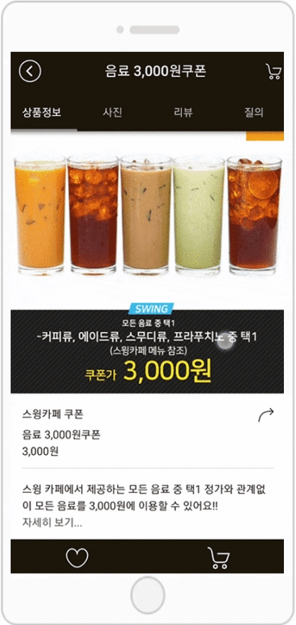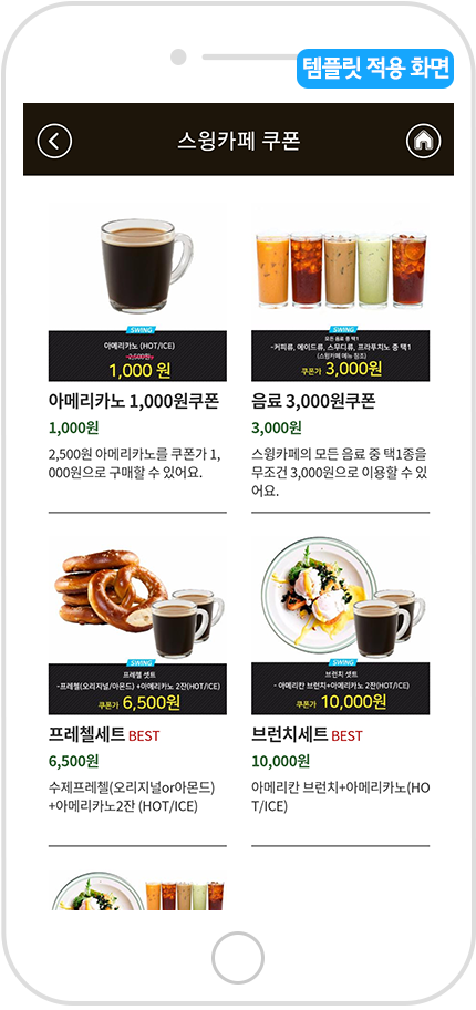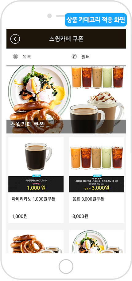 ‘스윙카페 쿠폰’ 카테고리를 앱에 적용시, 카테고리 목록이 표시되고 해당 카테고리에 등록된 상품들을 확인할 수 있습니다.