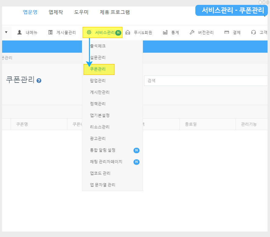 스윙 앱운영페이지 → 서비스관리 → 쿠폰관리 메뉴로 이동합니다.