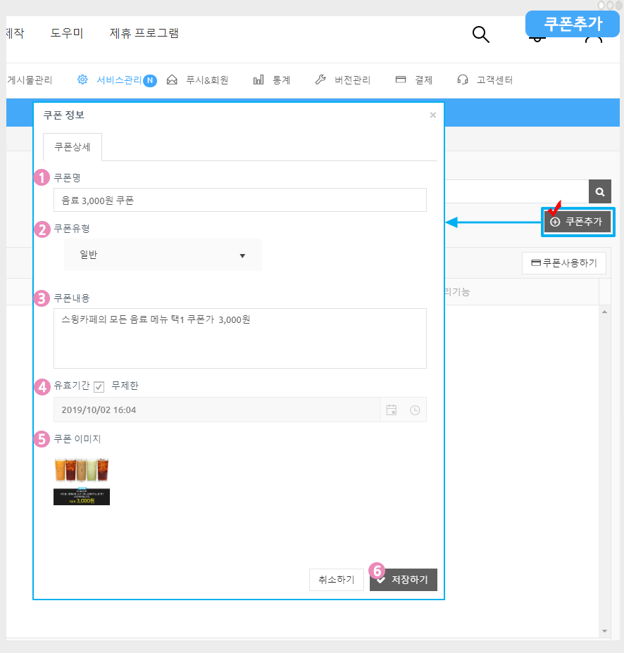 [쿠폰추가]버튼을 선택해서 쿠폰 정보를 입력합니다.